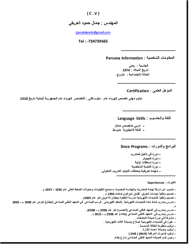 السيرة الذاتية مهندس كهرباء تمديدات كهربائية وصيانة الألات الكهربائية طلب عمل