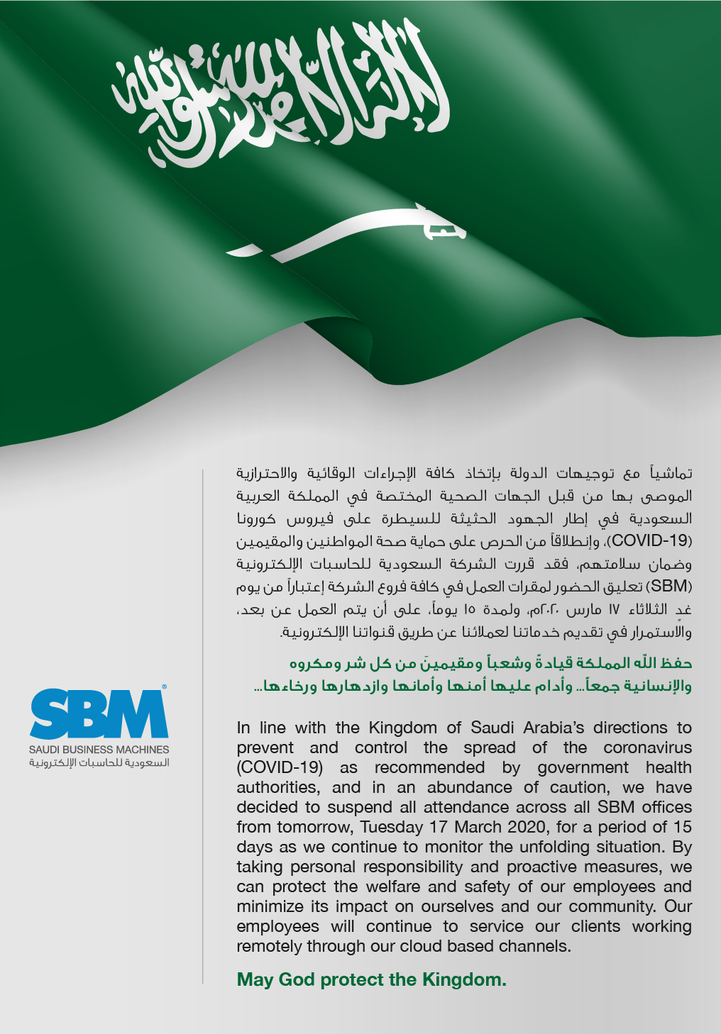 Saudi Business Machines V Twitter تماشيا مع توجيهات الدولة باتخاذ الإجراءات الوقائية للحد من فيروس كورونا قررت الشركة السعودية للحاسبات الإلكترونية تعليق الحضور لمقرات العمل اعتبارا من الغد ولمدة ١٥ يوما على