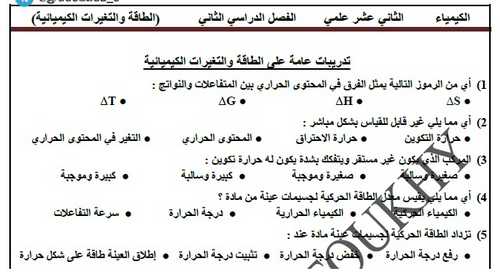 تدريبات على الطاقة والتغيرات الكيميائية كيمياء للصف الثاني عشر المتقدم الفصل الأول مدرستي الامارتية