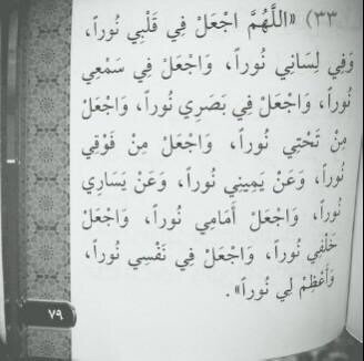 اللهم اجعل في قلبي نورا وفي لساني نورا واجعل في سمعي نورا واجعل في بصري نورا واجعل من خلفي نورا ومن أمامي نورا واجعل من فوقي نورا ومن تحتي نورا اللهم